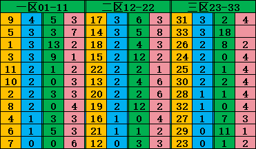 三区23-33号:出现0次的位置对应本期号码是:33号。