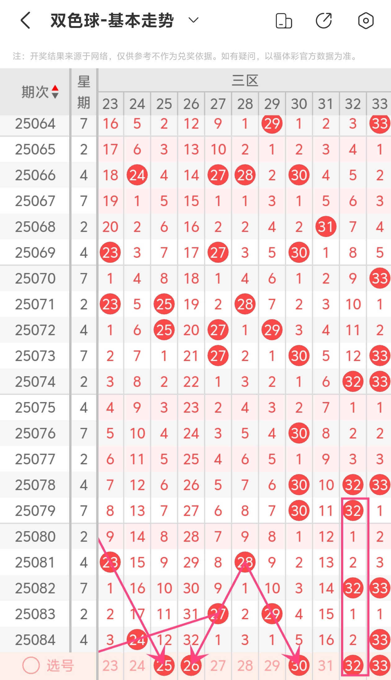 上期第三区间开出24 33,本期我们可以从上面走势图中看到选号的思路,25为斜连走势,26为斜连走势,30为斜连走势,32为对称形态走势,33为重码,综合以上分析本期第三区间推荐25 26 30 32 33