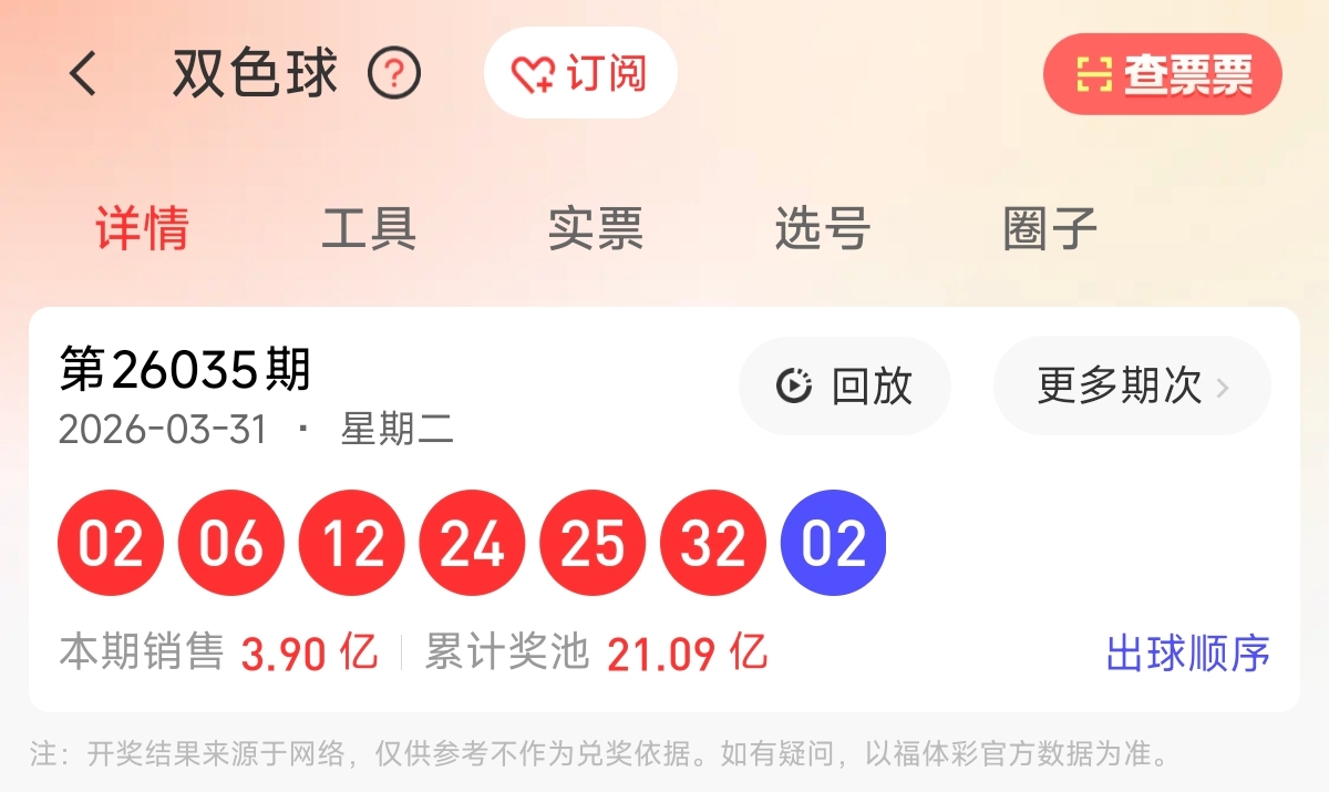 首先让我们回顾一下上期双色球26035期的开奖号码为02、06、12、24、25、32,蓝球02。和值101,跨度30,区间比为2:13,奇偶比为1:5。