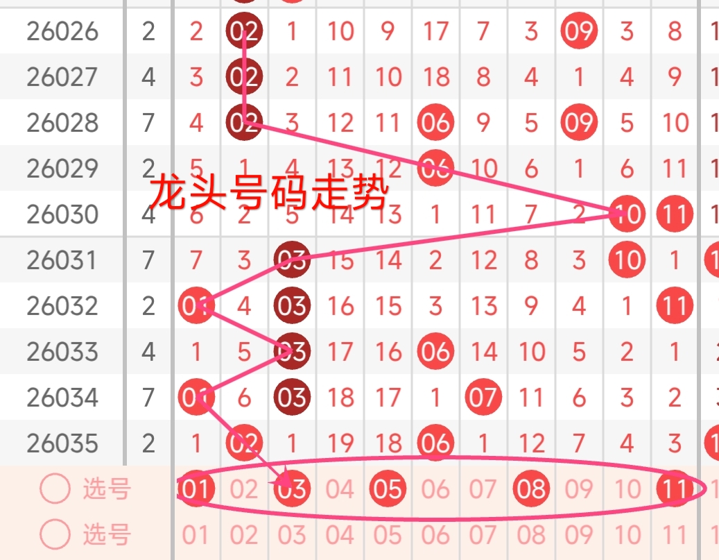 上期龙头号码为02,振幅上升了1点,开出偶数号码。从近期龙头号码走势来看,近期龙头号码波动频繁。近期龙头整体长期盘踞在01-03的超小号区间,近几期更是连续在01-03之间徘徊,超小号的聚集效应已经持续了五期,冷热转换的节点已经出现。从历史龙头走势来看,龙头号码持续走小之后,龙头号码大概率会向中部偏移,预计本期龙头号码看好在01-11区间开出,既延续了低位龙头的整体趋势,也可以关注上升回补的趋势。综合考虑,本期龙头号码可重点关注01、03、05、08、11。