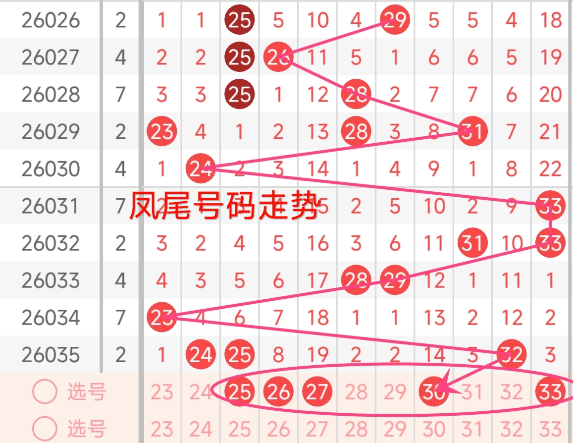 红球三区推荐(23~33): 上期开出3枚号码,号码为24、25、32,本期红三区建议出号1-2枚,本期红三区建议出关注号25、26、27、30、33。