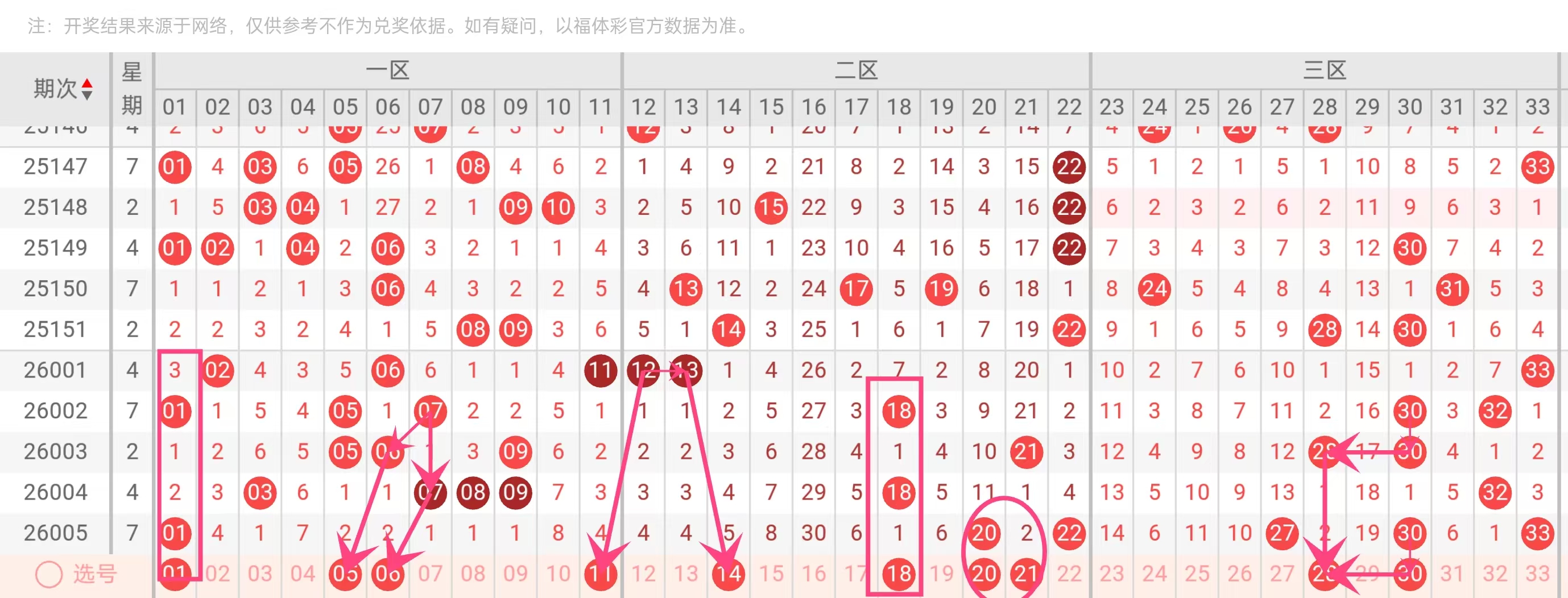 05、18:温号代表,近5期各出现2次,且分布在前后区,具备承上启下作用。18与近期活跃的20-30区间形成呼应。