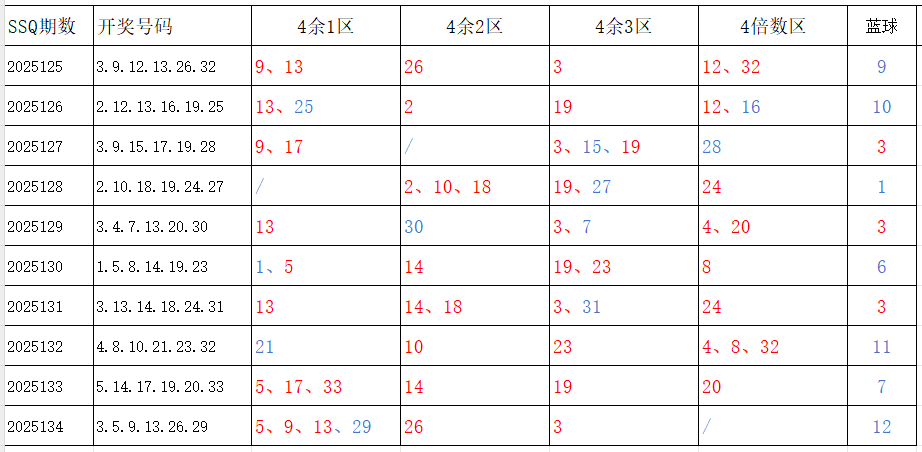 首先看上期回顾,双色球2025134期开奖结果:3.5.9.13.26.29+12。其中红球号码开出:4余1区号码4个,4余2区号码1个,4余3区号码1个,4倍数区号码0个。蓝球号码:冷号回补。再看上期个人分析:胆尾中出2尾3码!恭喜中出的虹友!