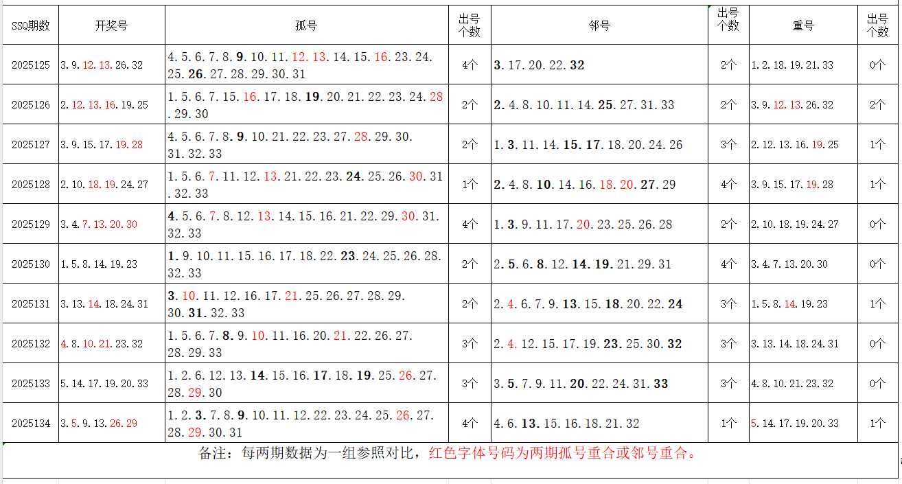 如图,以近两期数据为一组,进行对比分析。相同的孤号、邻号,可能在下期出1-4个左右。上期开出孤号4个,邻号1个,重号1个。本期参考孤号:1.7.11.15.16.17.18.19.20.21.22.23.24.31.32.33;邻号:2.4.6.8.10.12.14.25.27.28.30;孤、邻号重合号码精选:***(会员专区可见)。个人分析,仅供参考。