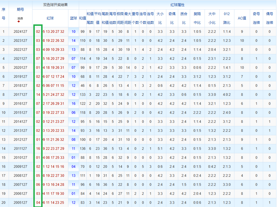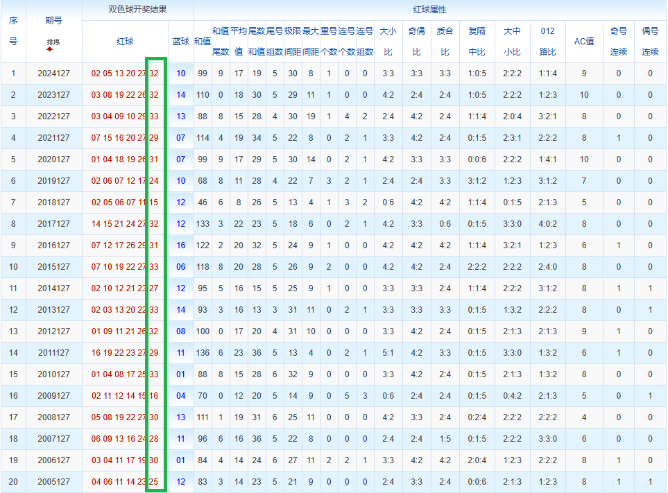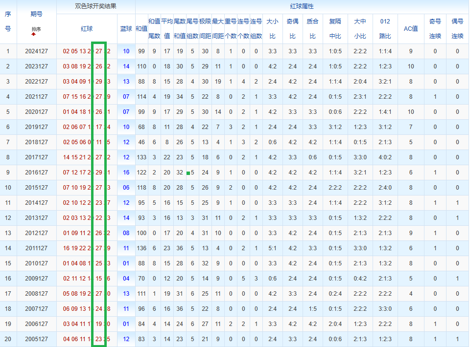 往年同期中选取出现次数靠前的数作为我们的分析对象,其数据有:27 19 02 05等