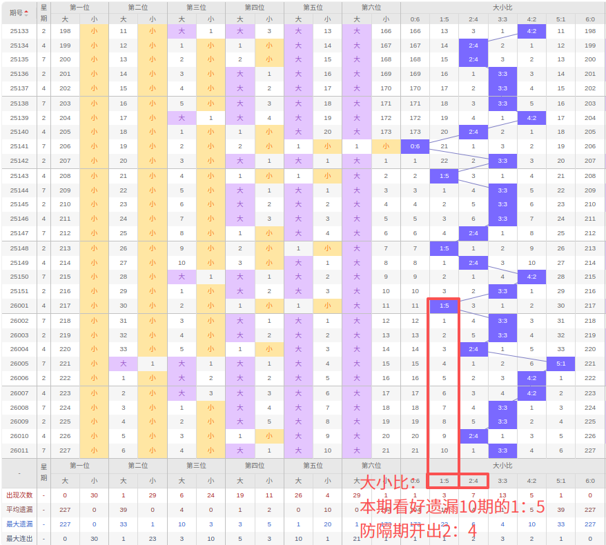 上期大小比:2:4,近10期大小比出现情况:3:3、3:3、2:4、5:1、4:2、4:2、3:3、3:3、2:4、3:3,最近10期出现5期3:3,出现2期4:2,出2期2:4,出现1期5:1,出现0期1:5,出现0期6:0,出现0期0:6,根据近10期规律本期看好遗漏10期的1:5,防隔期出2:4,综上所述推荐大小比推荐:2:4,重点关注:1:5。