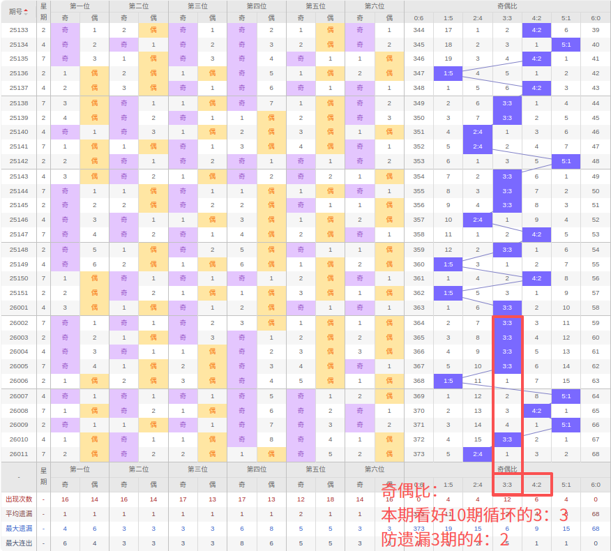 上期奇偶比:2:4,近10期奇偶比出现情况:3:3、3:3、3:3、3:3、1:5、5:1、4:2、5:1、3:3、2:4,最近10期出现5期3:3,出现1期4:2,出现1期2:4,出现2期5:1,出现1期1:5,出现0期6:0,出现0期0:6,根据近10期规律本期看好10期循环的3:3,防遗漏3期出4:2,综上所述推荐奇偶比推荐:4:2,重点关注:3:3。