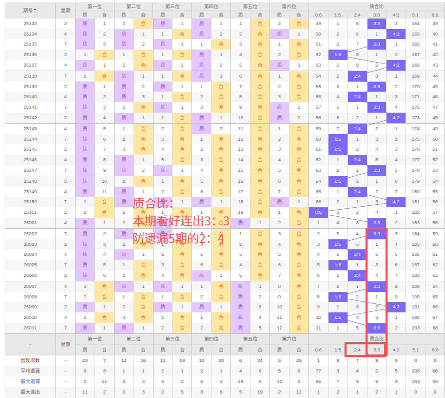 上期质合比:3:3,近10期质合比出现情况:3:3、1:5、2:4、1:5、2:4、3:3、1:5、4:2、1:5、3:3,最近10期出3期3:3,出现1期4:2,出现2期2:4,出现0期5:1,出现4期1:5,出现0期6:0,出现0期0:6,根据近10期规律本期看好连出的3:3,防遗漏5期的2:4,综上所述推荐质合比推荐:2:4,重点关注:3:3。