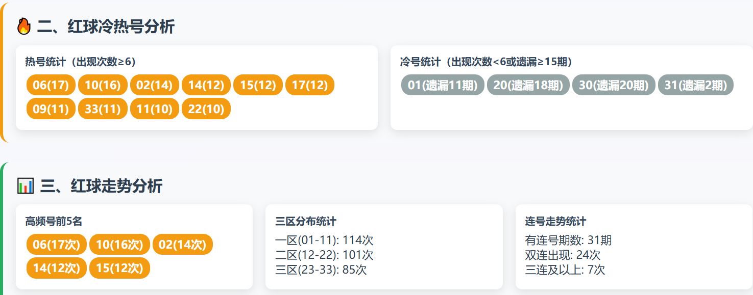 把近50期的数据拉出来观察,红球里最活跃的还属06(17次)、10(16次)、02(14次),以及14、15、17这些都保持在12次左右的高频水平。本期的11、15、17、22正好属于这股高频浪潮的“延续”。而在冷号一栏,像20、30这种十几期不见踪影的号码,迟早会要来一次“回补”,只是时间问题。三区分布上,一区(01-11)本期出了09和11,二区(12-22)出了15、17、22,三区(23-33)只给了一个26。整体是一区、二区偏多,三区相对乏力,这种失衡状态如果延续,接下来三区号码或许会有补位的趋势。