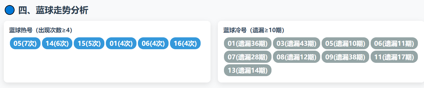 要说遗漏情况,本期红球并没有那种“沉睡太久”的号码突然回归。像01、20、30这样的冷门还在观望,遗漏期数分别有11期、18期和20期,都没有动静。刚刚回补的迹象比较弱,意味着冷热转换还处在过渡状态。蓝球方面就更有意思了,比如01和09这样的蓝球已经超过30期没冒头,基本可以当成“北极冷号”,短时间里不太值得期待。相反,05、14、15这类高频蓝球值得继续多看一眼。