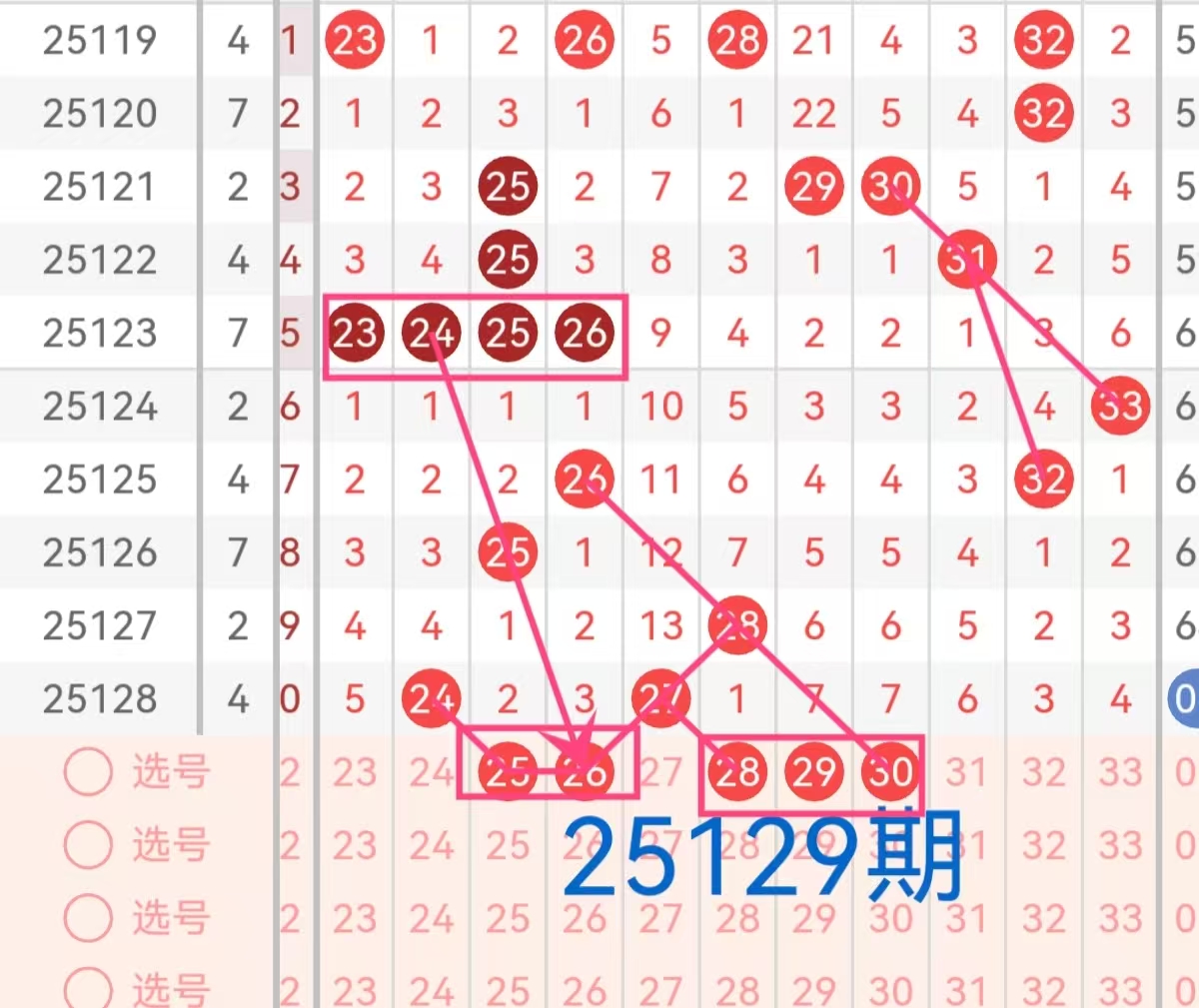 3. 第三区间(23-33):此区间在上期开出两个号码24和27,号码24在遗漏4期后开出,号码27为该期的凤尾号码,在遗漏13期后开出,且与前期开出的号码28形成斜连走势。这个凤尾号码相对偏小,本期预计凤尾号码会在这个号码由此增大。尤其是那些遗漏次数较大的号码,如号码26、29、30。根据历史开奖来看,最近该区间近期活跃度较高,本期考虑该区号码会有1-2号码继续开出。因此本区间关注号码25、26、28、29、30