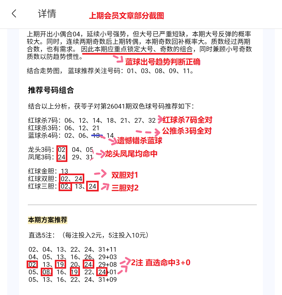 会员文章中龙头凤尾均命中,双胆对1,三胆对2,直选2注命中3码。