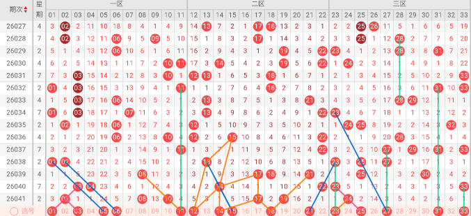 该区间呈现清晰的阶梯式上升节奏。具体表现为:每两期为一码循环,而上期打破规律冲高至3码。这种冲高往往意味着热度达到短期峰值,下一期通常会适度回调。结合历史,当一区出3码后,下一期大概率回落至2码或保持3码。建议关注号码:01、03、05、06、11。
