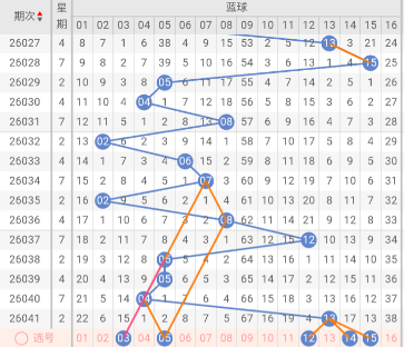 结合走势图综合判断, 蓝球推荐关注号码:03、05、12、14、15。
