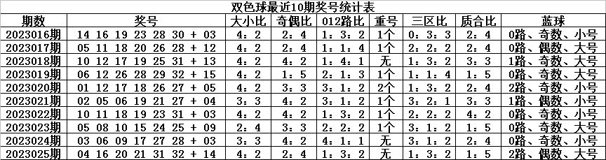 双色球第2023025期开出奖号为:04、16、20、21、31、32+14,其中红球号码奇偶比为2:4,大小比为4:2,012路比为1:3:2,和值为124,跨度为28,三区比为1:3:2,没有出现重复红球。蓝球开出偶数、大号、2路。