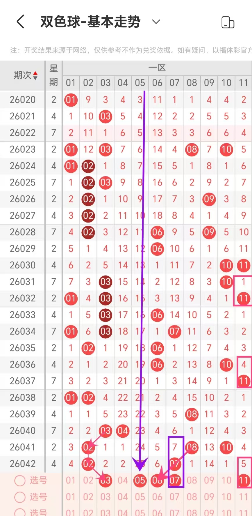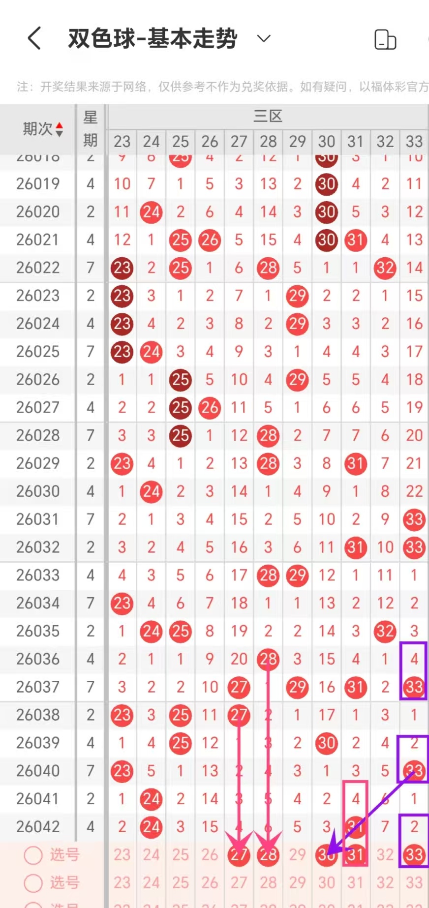 通过对同星期周日重号出现数量规律进行统计分析,本期考虑出号0-1个,即03-04-14-22-23-33出号0-1个