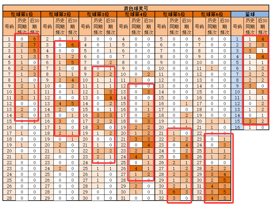 第6位,基本在24-33之间,历史同期频次最多的31-33;近30期,频次最多的为30-32,明显特征是合数优势;推荐重24-28-29-30-31-32-33。