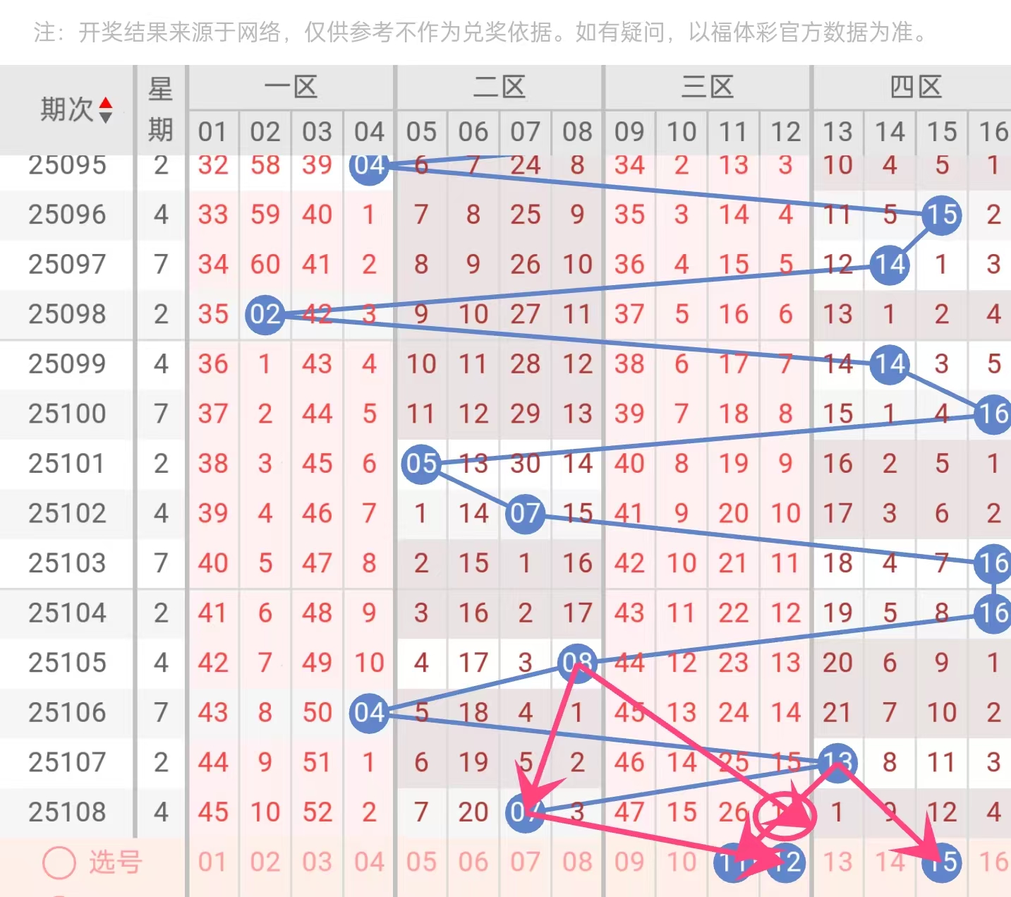 10号球:中段蓝球近期表现冷淡,出号趋势明显偏向两端(01-03和12-16)。从蓝球区域热度分析,08-11区间近期整体表现不够活跃,特别是10号球,已经连续多期未能开出。考虑到蓝球的出号特性,一旦某个区间陷入冷态,通常会持续一段时间,因此10号球在近期难有出色表现。