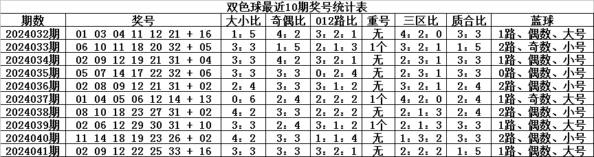 双色球第2024041期开出奖号为:02、09、12、22、25、33+16,其中红球号码奇偶比为3:3,大小比为3:3,012路比为3:2:1,和值为103,跨度为31,三区比为2:2:2,没有出现重复红球。蓝球开出偶数、大号、1路。