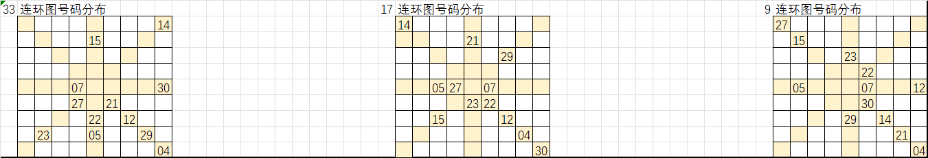 以上是33、17、9的连环图,可以在一起彩平台的九转连环图中查看历期号码分布,以当前期数来看,历史同期共有19期(2003-2023),那么我们就以19期号码来进行遗漏统计,然后把每个号码在近19期的遗漏总数统计出来,分别带入33、17、9的连环图,取出遗漏值大于16的号码,把这些号码在“环上”和“轴上”的相邻号码取出来进行统计,选取出次前15的号码作为大底。
