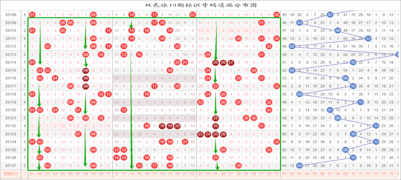 由于数据量大,不一一统计,下图为各个号码分别在33、17、9连环图上的遗漏统计汇总图: