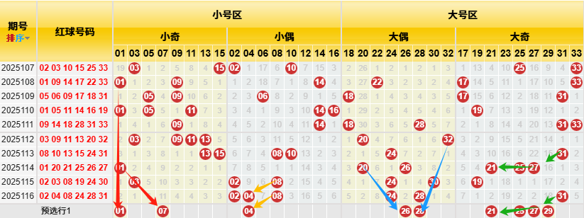 【数据参数】依前区大小奇偶属性,组合分成小号(0-16)大号(17-33)区,小号区分成小奇(1、3、5、7、9、11、13、15)和小偶(2、4、6、8、10、12、14、16),大号区分成大偶(18、20、22、24、26、28、30、32)和大奇(17、19、21、23、25、27、29、31、33)。