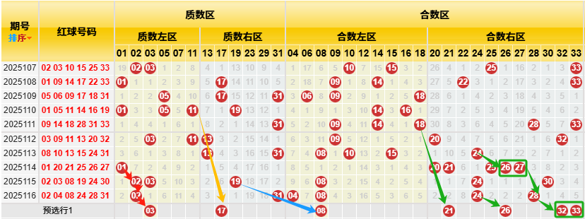 【数据参数】 根据前区质合小大属性,组合成上图质数区1、2、3、5、7、11、13、17、19、23、29、31和合数区4、6、8、9、10、12、14、15、16、18、20、21、22、24、25、26、27、28、30、32、33,质数区分为质数左区1、2、3、5、7、11和质数右区13、17、19、23、29、31;合数区分为合数左区4、6、8、9、10、12、14、15、16、18)和合数右区20、21、22、24、25、26、27、28、30、32、33。