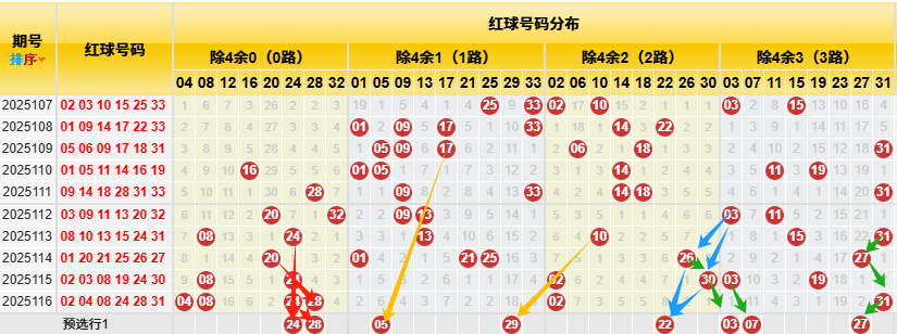 【数据参数】根据前区除4余数,组合成上图分别为余0路(简称0路)4、8、12、16、20、24、28、32);余1路(简称1路)1、5、9、13、17、21、25、29、33;余2路(简称2路)2、6、10、14、18、22、26、30;余3路(简称3路)3、7、11、15、19、23、27、31。