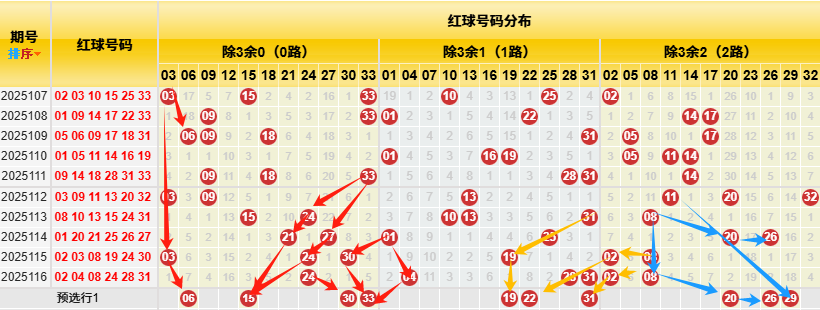 【数据参数】 根据前区除3余数,组合成上图分别为余0路(简称0路)3、6、9、12、15、18、21、24、27、30、33;余1路(简称1路)1、4、7、10、13、16、19、22、25、28、31; 余2路(简称2路)2、5、8、11、14、17、20、23、26、29、32。