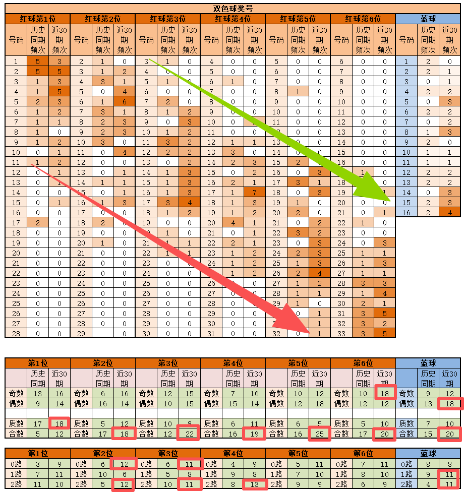 蓝球,历史同期频次最多的为1-2-等等;近30期,频次最多的为16,明显特征是合数12路优势;推荐重点5-14-15-16。