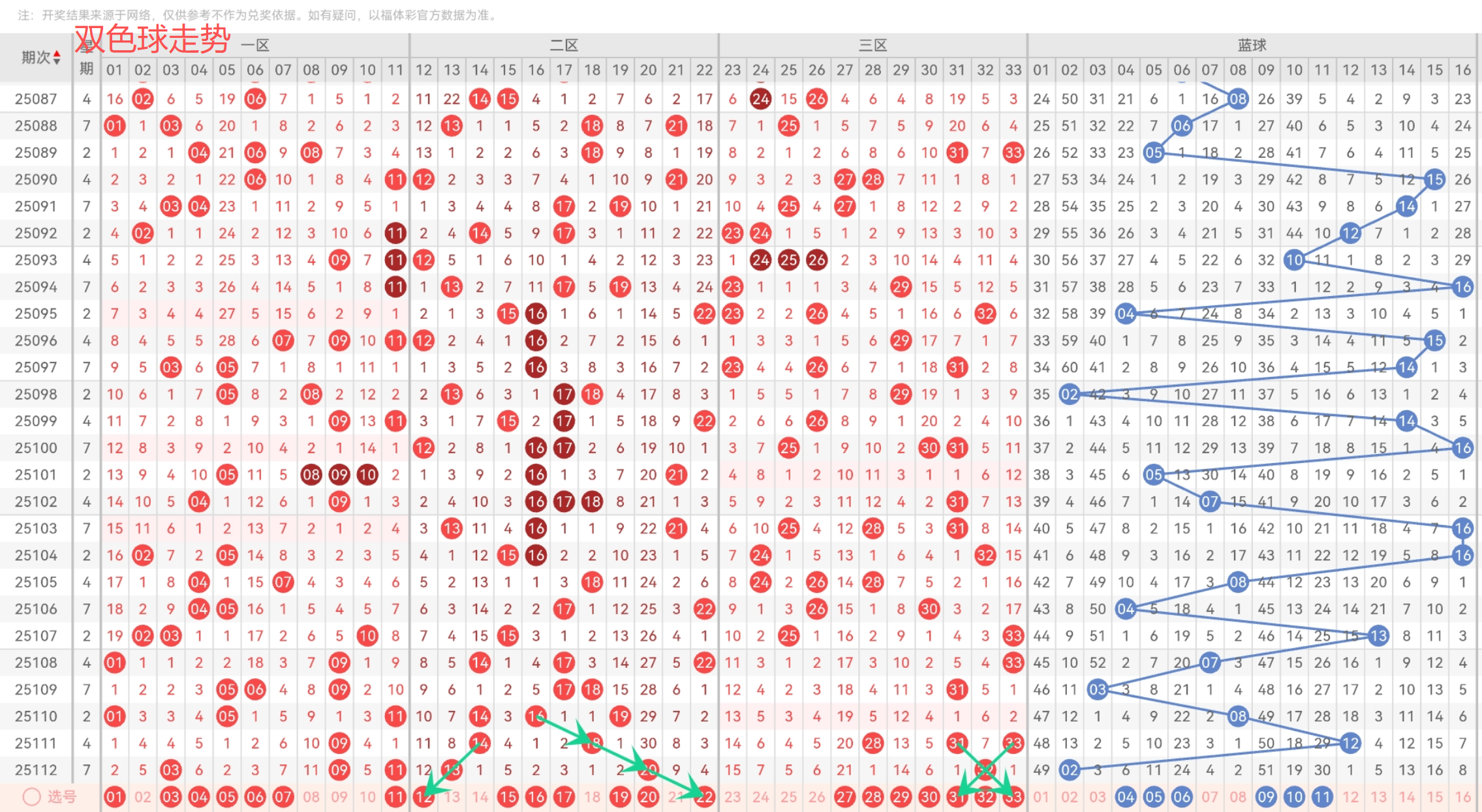 红球三区,上期仅仅出了1码,本期看好1-2码,最近总体上后路表现比较显眼,本期看好后路的出号机会,其中走势规律比较好看的是号码31和33;