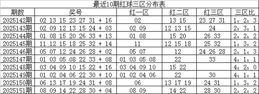 一区上期走温,出现2个奖号,近10期开出23个红球,表现非常活跃,本期看好继续大热,开出3个红球,参考号码02、03、05;二区上期走温,开出2个红球,近10期共开出20个红球,出号比例与理论持平,本期预计继续走温,出现1-2个红球,注意号码18;三区上期走温,开出2个红球,近10期共开出17个红球,走势相对较冷,本期预计继续温冷,看好号码26、32;