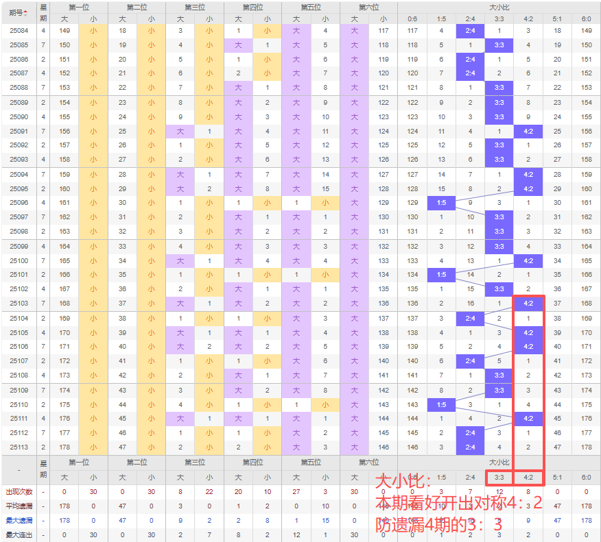 上期大小比:2:4,近10期大小比出现情况:2:4、4:2、4:2、2:4、3:3、3:3、1:5、4:2、2:4、2:4,最近10期出现2期3:3,出现3期4:2,出4期2:4,出现0期5:1,出现1期1:5,出现0期6:0,出现0期0:6,根据近10期规律本期看好对称的4:2,防遗漏4期的3:3,综上所述推荐大小比推荐:3:3,重点关注:4:2。