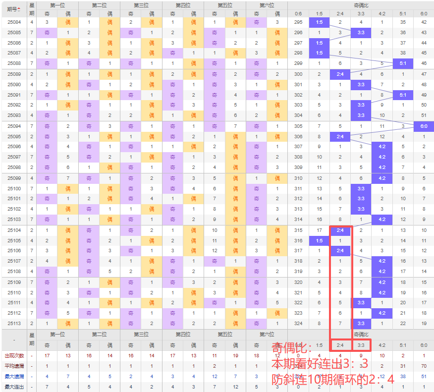 上期奇偶比:3:3,近10期奇偶比出现情况:2:4、1:5、2:4、4:2、4:2、4:2、4:2、3:3、4:2、3:3,最近10期出现2期3:3,出现5期4:2,出现2期2:4,出现0期5:1,出现1期1:5,出现0期6:0,出现0期0:6,根据近10期规律本期看好连出3:3,防斜连10期循环的2:4,综上所述推荐奇偶比推荐:2:4,重点关注:3:3。