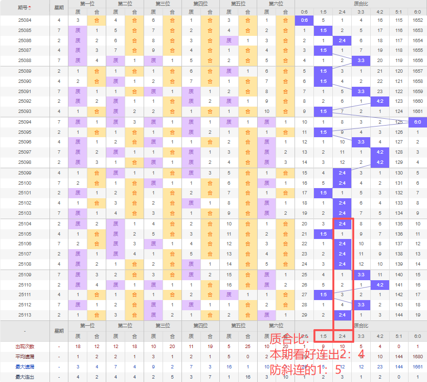上期质合比:2:4,近10期质合比出现情况:2:4、1:5、2:4、2:4、2:4、3:3、4:2、1:5、3:3、2:4,最近10期出2期3:3,出现1期4:2,出现5期2:4,出现0期5:1,出现2期1:5,出现0期6:0,出现0期0:6,根据近10期规律本期看好连出2:4,防1斜连的1:5,综上所述推荐质合比推荐:1:5,重点关注:2:4。
