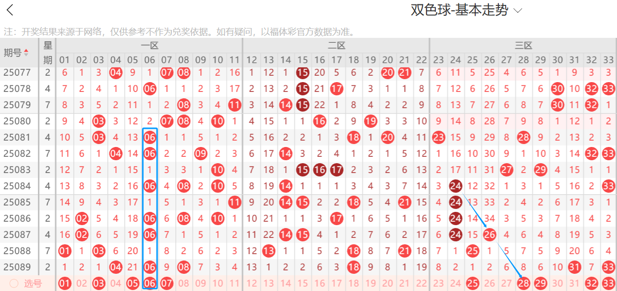 龙头凤尾:上期的龙头只看一路号,判断完全正确,拿下龙头4,大直播间给大家讲解了4.9.32出一胆,其实就是看好4,还有8.10.17出一胆,判断正确,开出8,可惜没看8,所以上期的红球缺失一个8,但是可以看出出号区域位置这就很不错,上期专属给大家讲解4.6的出号依据相当精彩,本期仍然要注意6,近十期这个6竟然开出高达六次,真的是热爆了,本期可以出龙头的号,大范围看是1.3.5.6.7,那么通过单双数还有012路即可缩小范围,还有头尾表,上期的头尾表又一次开出6红,本期的头尾表会继续缩小范围,所以双色球的头尾表是很有 参考意义的,凤尾大范围看25.28.29.32.33都可以出凤尾,注意这个28走势很好看,以上就是对龙头凤尾的初步看法,更具体的直播间分享。