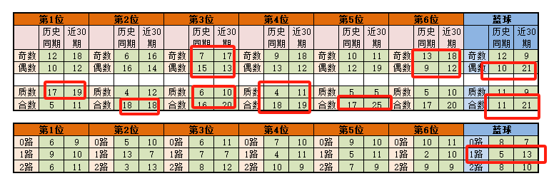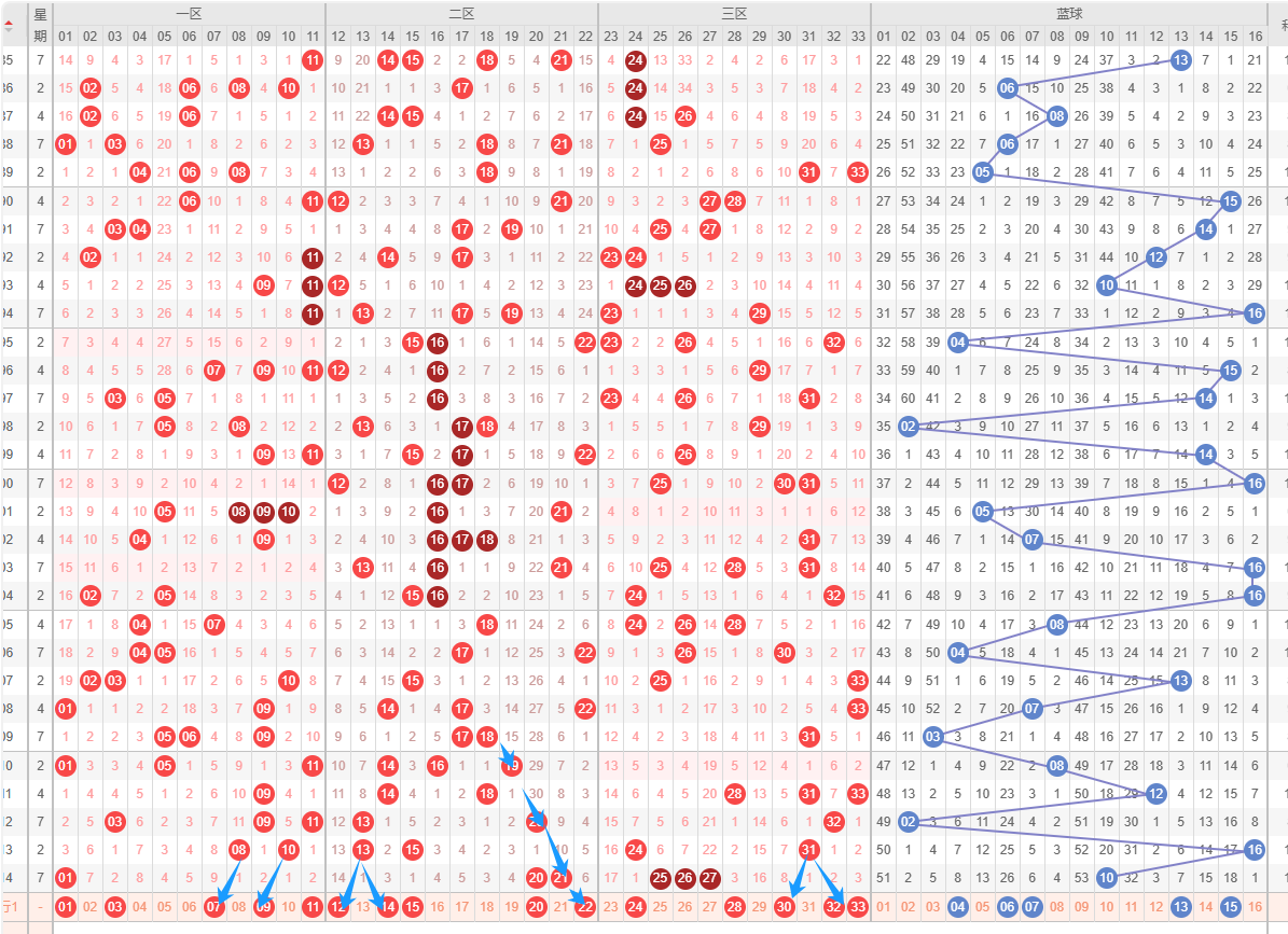 6位,基本在21-33之间,历史同期频次最多的为27-29-32-3330期,频次最多的为31,明显特征是合数奇数优势;推荐重点27-29-31-32-33
