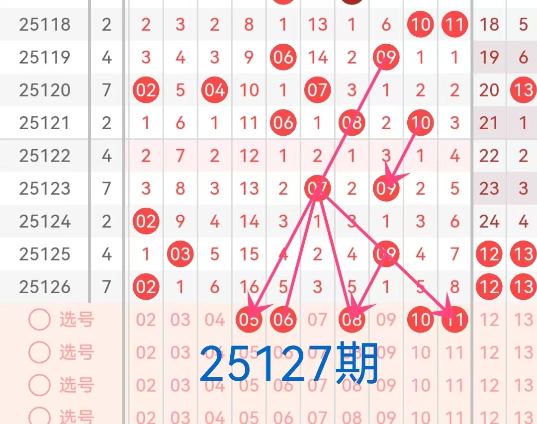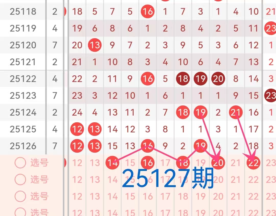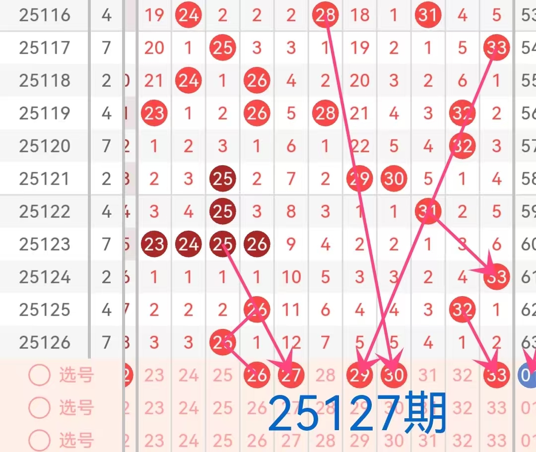 3. 第三区间(23-33):此区间在上期开出一个号码25,号码25为该期的凤尾号码,在遗漏2期后开出,且与前期开出的号码26形成斜连走势。这个凤尾号码相对较小,本期预计凤尾号码会由此增大。尤其是那些遗漏次数较大的号码,如号码26、27、29、30。根据历史开奖来看,最近该区间近期活跃度较高,本期考虑该区号码会有1-2号码继续开出。因此本区间关注号码26、27、29、30、33