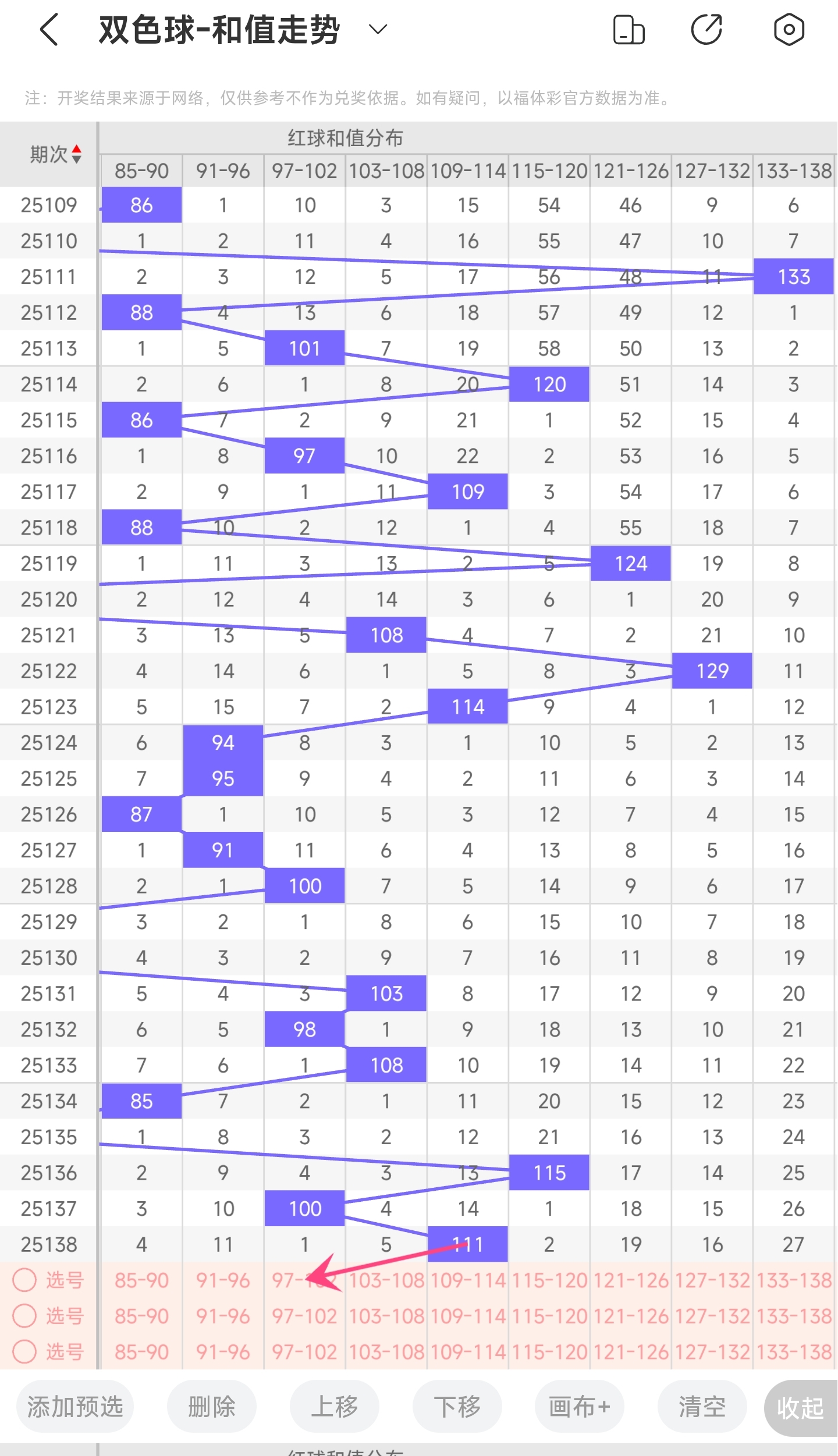 上期和值为111,而近5期和值为85,74,115,100,111,上期和值较前一期增加了11,振幅为11。100和值是属于近30期内开出的比较大的和值,上升的空间比较小,下降的空间比较大。本期看好和值变小,所以推测本期和值趋势是大概率往左,和值变小,小概率继续往右,和值变大。