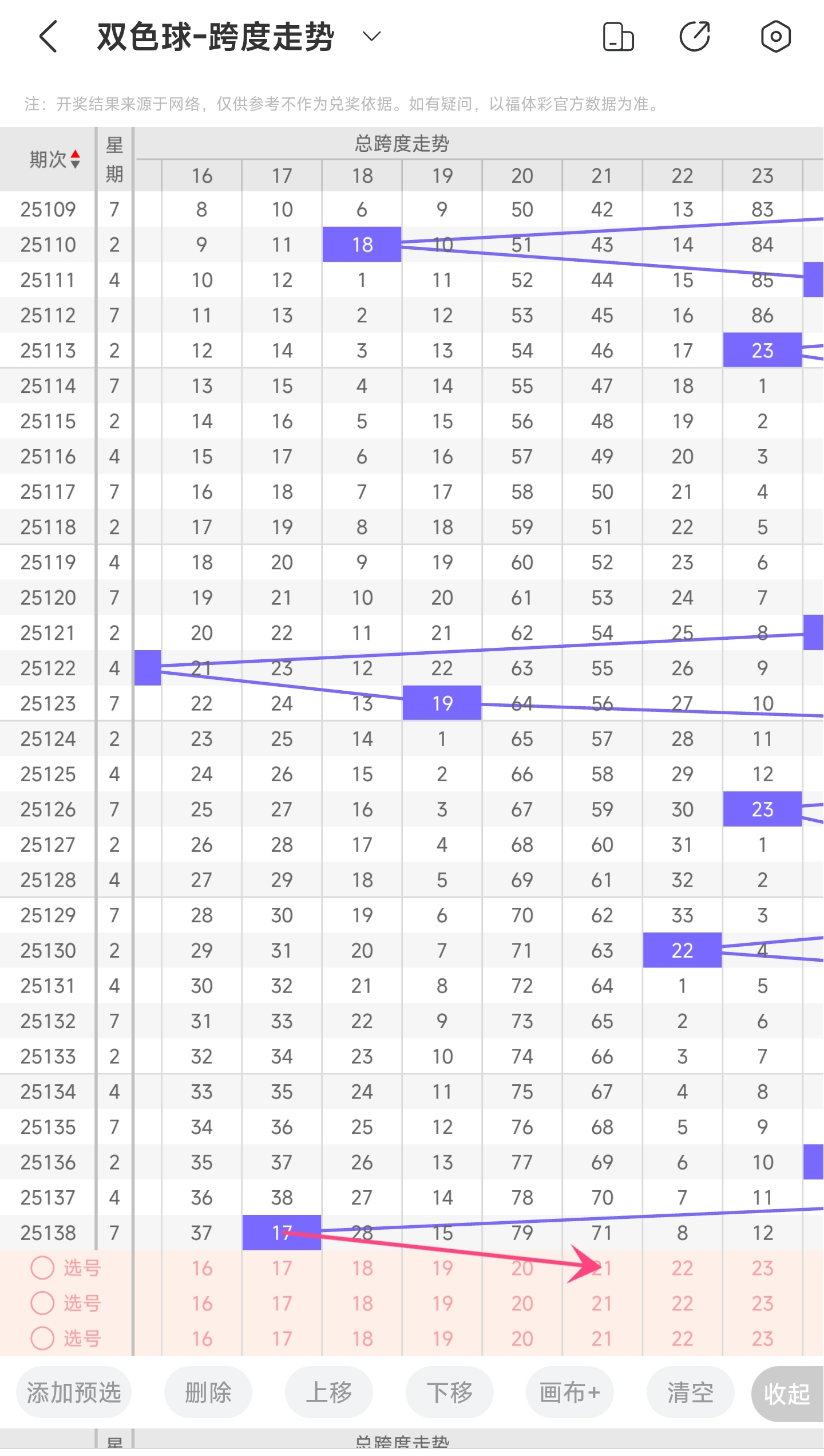上期龙头为10,凤尾为27,跨度为17,往前一期跨度是27,偏移量为10。17跨度值是30期内开出的很小的跨度值。上升的空间很大,下降的空间很小,本期看好跨度值变大,所以推测本期跨度趋势是往右,跨度变大,极小概率往左,跨度值变小。