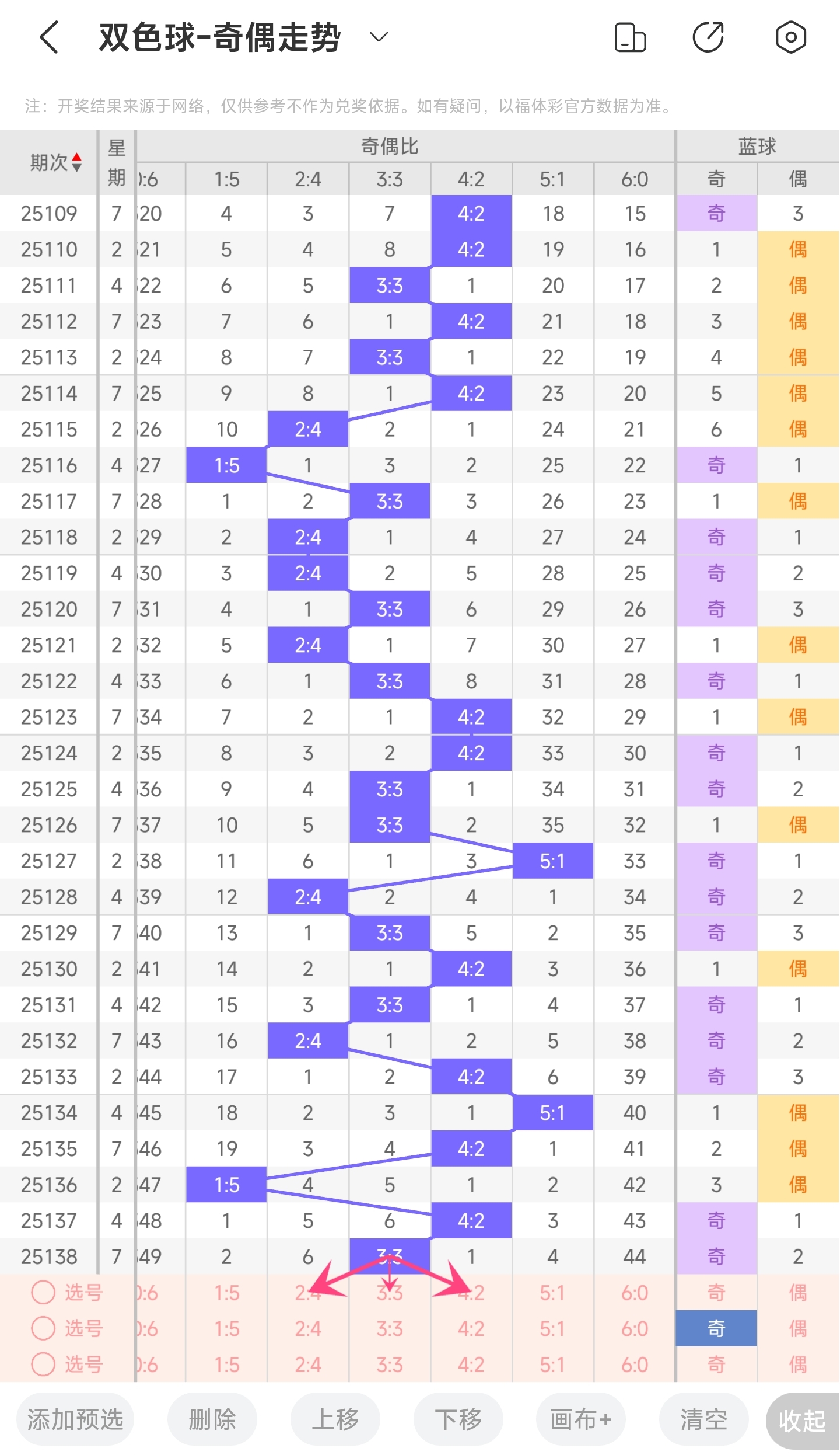 上期奇偶比为3:3,分别为偶奇偶奇偶奇。往前一期奇偶比为4:2。通过近30期内奇偶走势的数据分析,目前1:5奇偶比开出的概率是6.66%,5:1奇偶比开出的概率是6.66%,3:3奇偶比开出的概率是33.33%,4:2奇偶比开出的概率是33.33%,2:4奇偶比开出的概率是20%,6:0奇偶比开出的概率是0%。与前一期相比,3:3奇偶比概率变大,4:2奇偶比概率变小。通过分析走势图,上期开了3:3奇偶比,本期有可能继续开出,也有可能开4:2或者2:4奇偶比,本期看好2:4奇偶比。所以本期推测本期可能开2:4奇偶比,其次是3:3奇偶比或者4:2奇偶比,最后是1:5和5:1奇偶比。