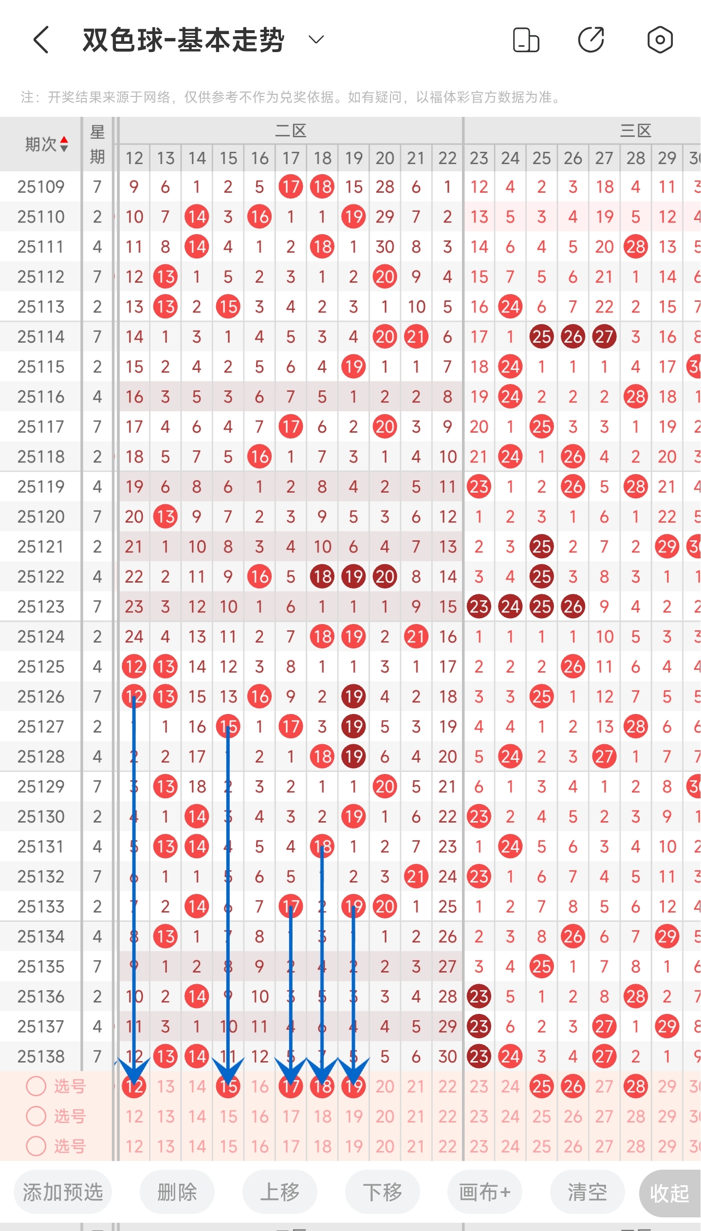 上一期三区开出了23,24和27号球。往前一期出了23,27和29号球。通过走势图分析,可以看到最近几期三区都比较热门,上期也是开了3个号码,推测本期有可能会有所减少。上期凤尾开27号球,处在中间位置,本期看好回补右边,凤尾重点关注右边的号码。除了凤尾其余号码则有可能开在左边,也要重点关注。最后再结合冷热号和遗漏期数,本期我们可以关注25,26,28,31,33等号。综上所述本期我们推测有可能开出25,26,28,31,33等号码。