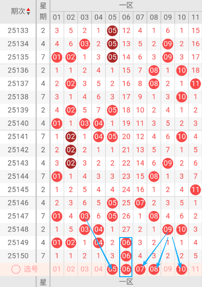 根据走势图可以看出当区段,141期开出02.04.05.10四个号码球 ,142期开出02一个号码球 ,143期开出02.09二个号码球 ,144期开出01.08二个号码球 ,145期开出11一个号码球 ,146期开出05.07二个号码球 ,147期开出01.03.05.08四个号码球 ,148期开出03.04.09.10四个号码球 ,149期开出01.02.04.06四个号码球 ,150期开出06一个号码球 ,按照如此规律本期当前区判断可能会开出1双1单。我们看下当前区上期开出06重叠号,那么本期当前区要定重叠号的情况下可关注06号码球。再看下当前区段上期没有开出斜连号,当期选号得留意07斜连号。建议重点关注05.06.07.08.10