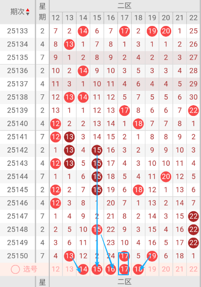 根据走势图可以看出当前区段,141期开出12.13二个号码球 ,142期开出13.15二个号码球 ,143期开出12.13.15三个号码球 ,144期开出15.20二个号码球 ,145期开出12.15.18三个号码球 ,146期开出12一个号码球 ,147期开出22一个号码球 ,148期开出15.22二个号码球 ,149期开出22一个号码球 ,150期开出13.17.19三个号码球 ,按照如此规律本期当前区可能开出1双1单。我们看下当前区上期没有开出重叠号,那么本期当前区要定重叠号的情况下可关注17号码球。再看下当前区上期没有开出斜连号,当期选号得留意斜连18号码球。本区重点关注14.15.16.17.18