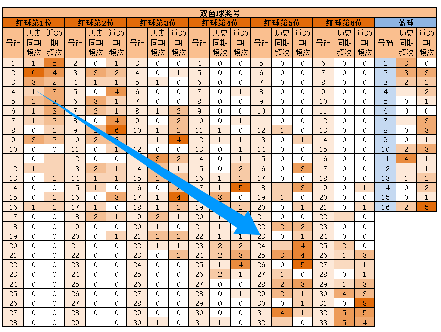 蓝球,历史同期频次最多的为11;近30期,频次最多的为16,明显特征是合数优势;推荐重点2-3-7-8-10-16。