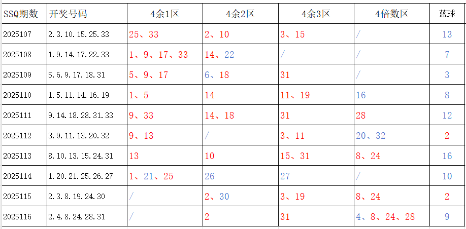 分享第一个数据分析:四分区统计数据。相对于传统的三分区,个人习惯使用四分区,就是把33个红球号码除以4,所得的余数分区如下: