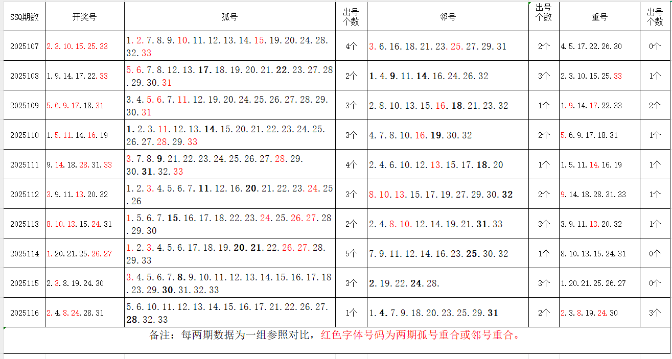 如图,以近两期数据为一组,进行对比分析。相同的孤号、邻号,可能在下期出1-4个左右。上期开出孤号1个,邻号2个,重号3个。本期参考孤号:6.10.11.12.13.14.15.16.17.18.19.20.21.22.26.33;邻号:1.3.5.7.9.23.25.27.29.30.32;孤、邻号重合号码精选:***(会员专区可见)。个人分析,仅供参考。