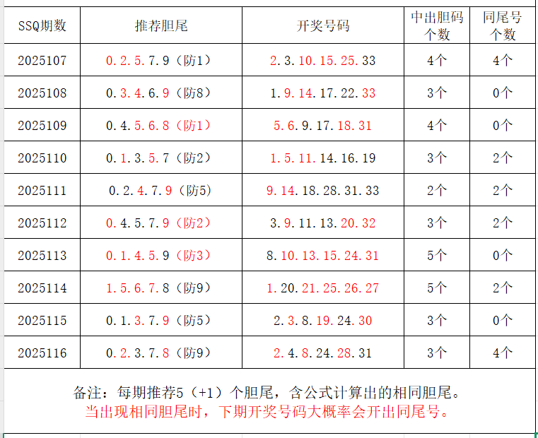 如图,每期推荐胆尾中出1-4个。上期推荐胆尾中出2尾3码!推荐胆尾是按照公式计算的顺序,不定位红球号码的顺序。本期推荐胆尾:7尾/2尾/1尾/0尾/6尾  。加推重点胆尾:***(会员专区可见)。推荐胆码号码:***(会员专区可见)。个人分析,仅供参考。