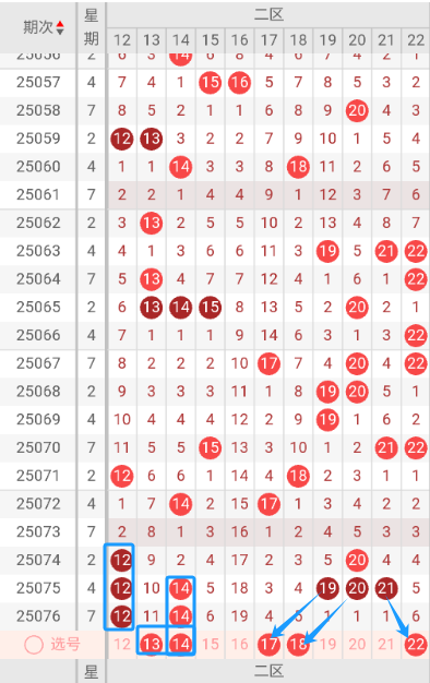 根据走势图可以看出当前区段,067期开出了17.20.22三个号码球,068期开出了19.20二个号码球,069期开出了19一个号码球,070期开出了15.21.22三个号码球,071期开出了12.18二个号码球,072期开出14.17二个号码球,073期没有开出号码球,074期开出了12.20二个号码球,075期开出了12.14.19.20.21五个号码球,076期开出了12.14二个号码球 ,按照如此规律本期当前区可能开出1单1双。我们看下当前区上期开出12.14重叠号,那么本期当前区要定重叠号的情况下可关注14号码球。再看下当前区上期没有开出斜连号,当期选号得留意斜连13号码球。本区重点关注13.14.17.18.22