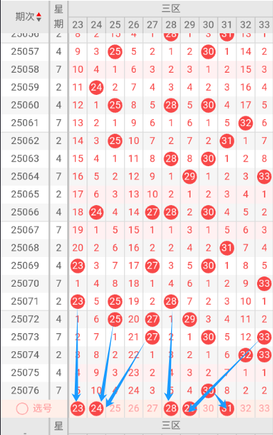 根据走势图可以看出当前区,067期没有开出号码球 ,068期开出了31一个号码球,069期开出了23.27.30三个号码球,070期开出了33一个号码球,071期开出了23.25.28三个号码球,072期开出了25.27.29三个号码球,073期开出了27.30.33三个号码球,074期开出来32.33二个号码球,075期没有开出号码球,076期开出了30四个号码球,按照如此规律判断本期当前区可能开出2单1双1单。我们看下当前区上期没有开出重叠号,那么本期当前区要定重叠号的情况下可关注30号码球。再看下当前区上期没有开出斜连号,当期选号得留意31斜连号。本区重点关注23.24.28.29.31